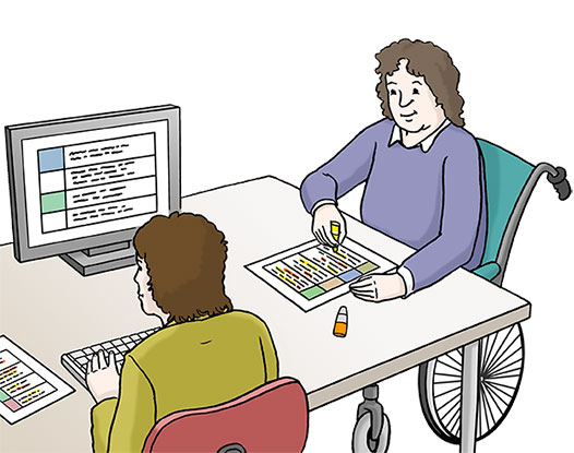 | Die Seiten wurden übersetzt von: Büro für Leichte Sprache Iserlohn Diakonie Mark-Ruhr - Teilhabe und Wohnen Mandy Brösner | Die Seiten wurden geprüft | Die Bilder sind von: © Lebenshilfe für Menschen mit geistiger Behinderung Bremen e.V., Illustrator Stefan Albers |